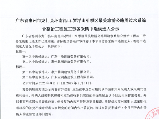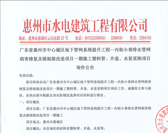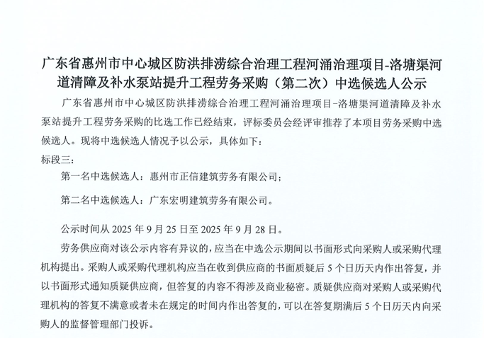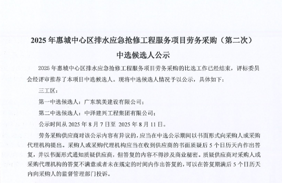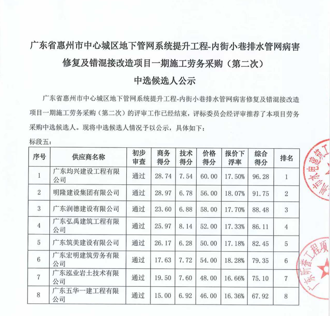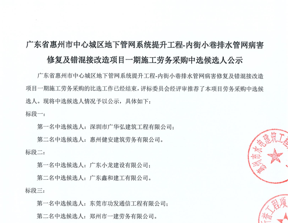 廣東省惠州市中心城區(qū)地下管網(wǎng)系統(tǒng)提升工程-內(nèi)街小巷排水管網(wǎng)病害修復(fù)及錯(cuò)混接改造項(xiàng)目一期施工勞務(wù)采購(第二次)中選候選人公示……